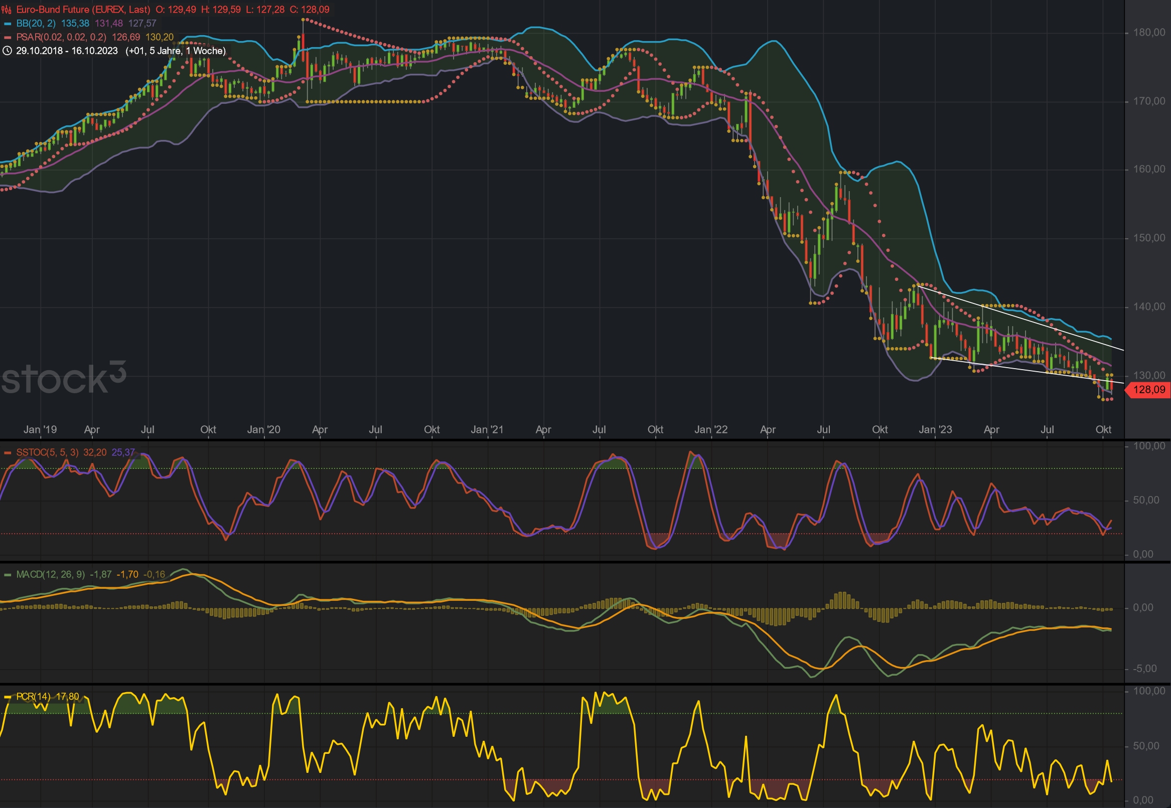Der Euro-Bund Future ist diese Woche gefallen. Ein fallender Kurs bedeutet meist steigende Zinsen. Wir erwarten kurzfristig für die nächsten 1-3 Wochen eher etwas steigende Zinsen ca. 0,1 bis 0,25 Prozent.