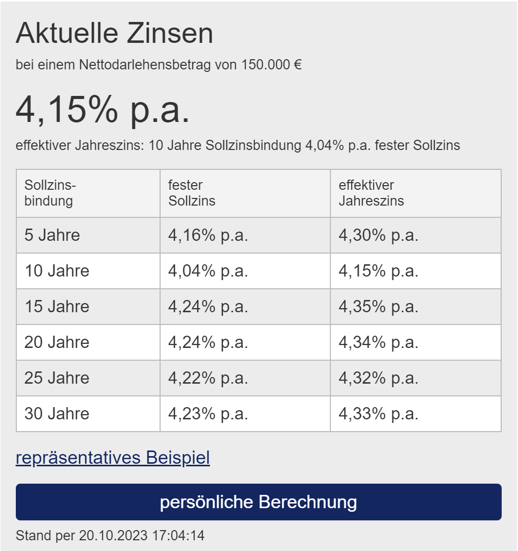 Am Freitag, den 20.10.2023 sind die Top-Finanzierungszinsen im Berechnungsbeispiel mit 10 Jahren Zinsbindung und 60% Beleihungsauslauf bei 4,15% p.a. effektivem Jahreszins. Die aktuellen Immobilienzinsen können sich täglich ändern. Wer seine Immobilenfinanzierung plant oder bereits eine passende Immobilie zum Kauf gefunden hat, sollte immer aktuelle Immobilienzinsen für seine eigene Kalkulation verwenden. Ich helfe Ihnen gerne dabei die passende Immobilienfinanzierung zu finden. Jetzt >>>Beratung<<< vereinbaren. Als Finanzierungsmakler in Karlsruhe können wir Immobilienfinanzierungen mehr als 300 Banken für Ihre Immobilie